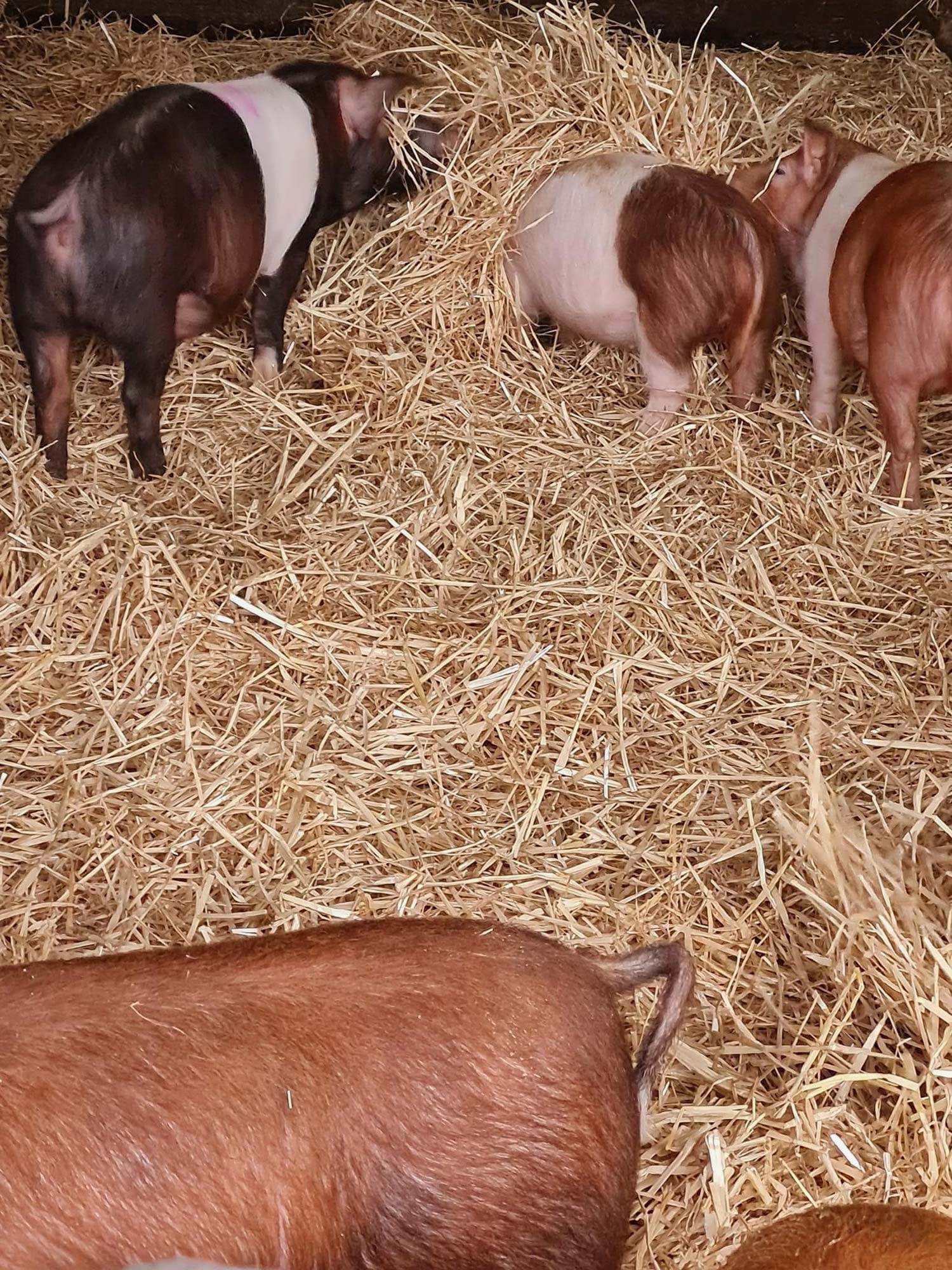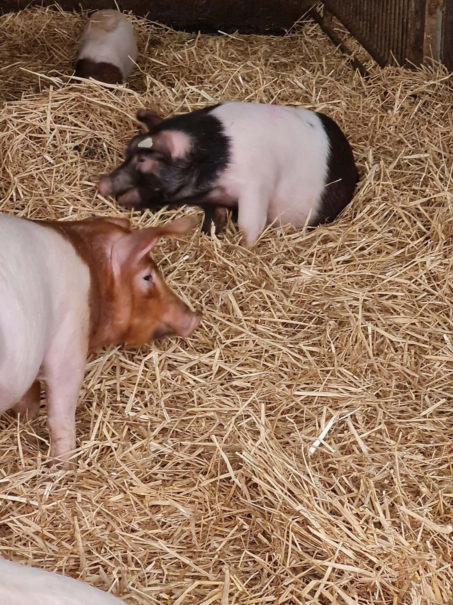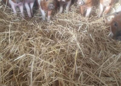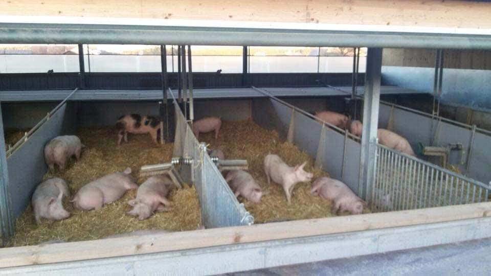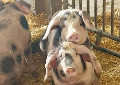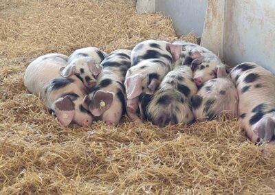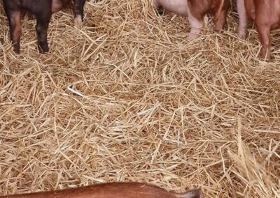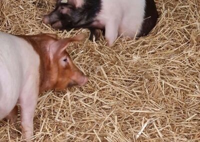 Die Schweine haben viel Platz in ihrem Laufstall, der reichlich Tageslicht bietet. Sie können im frischen Stroh wühlen, sich aneinander kuscheln und neugierig die Besucher beobachten. Unsere Schweine werden hauptsächlich mit selbst angebautem Getreide sowie Lupinen und Erbsen gefüttert. Bei uns gibt es keine vorbeugende Medikamentengabe, wie sie in der Massentierhaltung üblich ist.