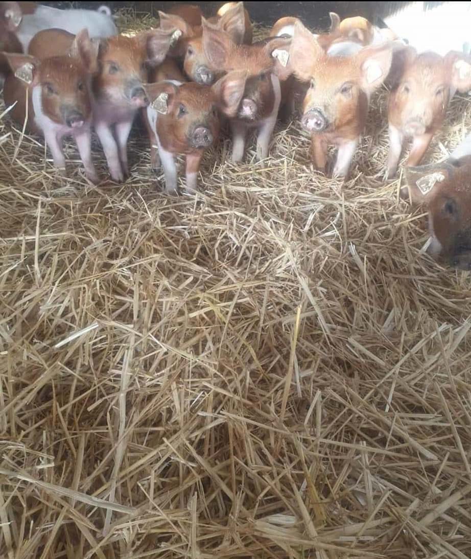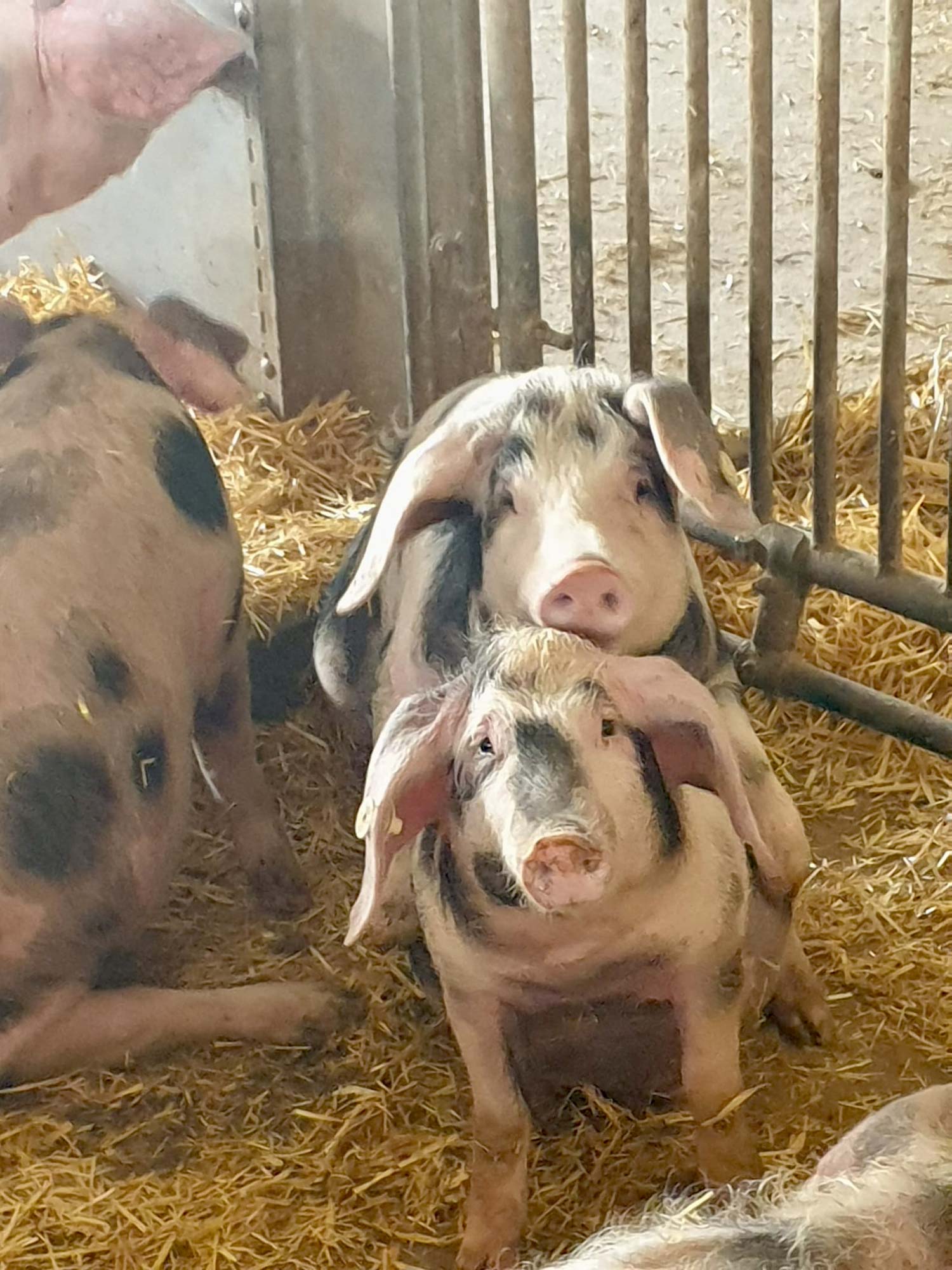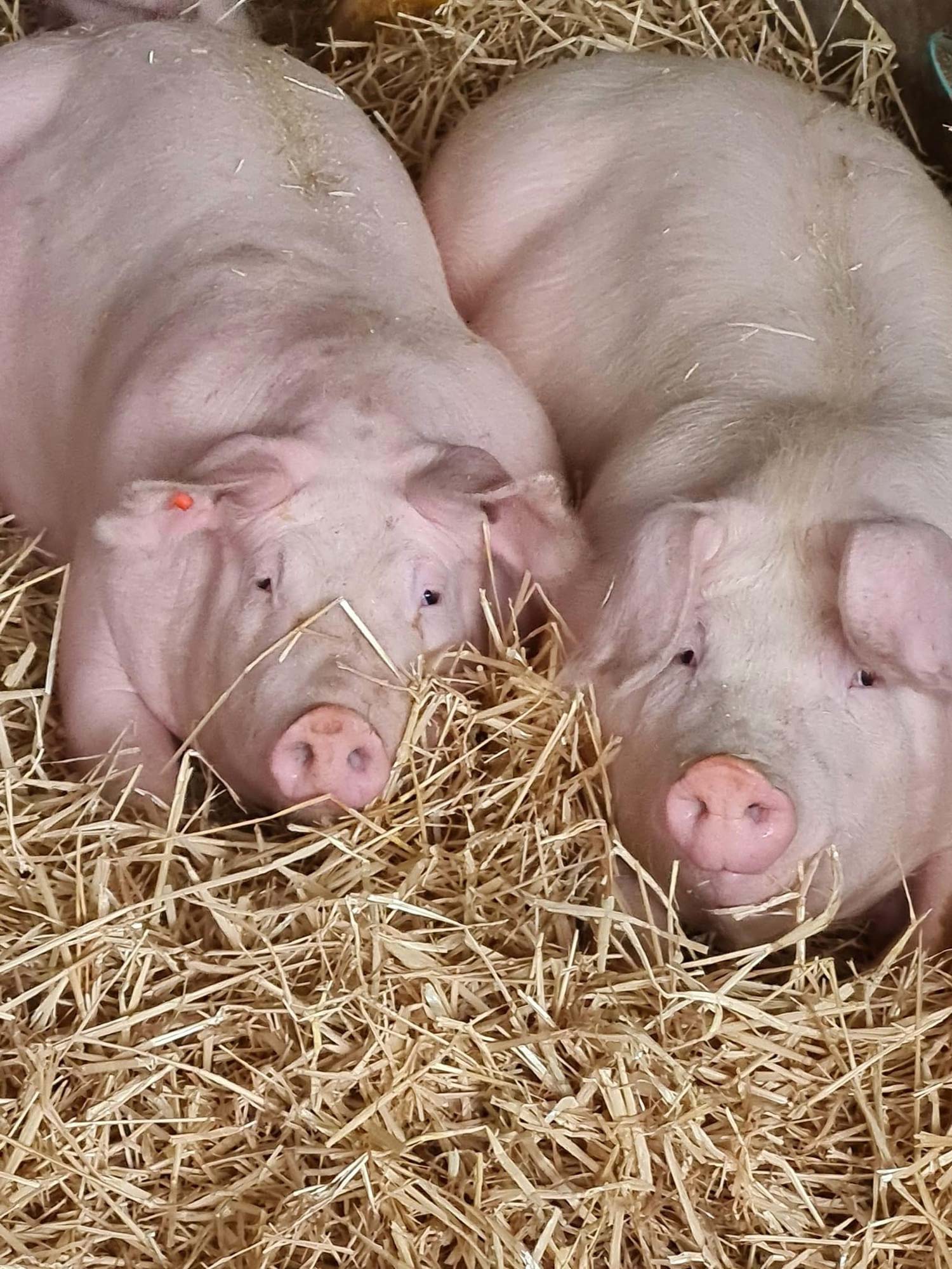 Die Schweine haben viel Platz in ihrem Laufstall, der reichlich Tageslicht bietet. Sie können im frischen Stroh wühlen, sich aneinander kuscheln und neugierig die Besucher beobachten. Unsere Schweine werden hauptsächlich mit selbst angebautem Getreide sowie Lupinen und Erbsen gefüttert. Bei uns gibt es keine vorbeugende Medikamentengabe, wie sie in der Massentierhaltung üblich ist.